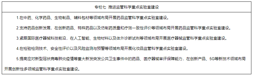 6.深入實施中國藥品監管科學行動計劃。統籌推進監管科學研究基地和重點實驗室建設,開展監管科學等研究。將藥品監管科學研究納入國家相關科技計劃,重點支持中藥、疫苗、基因藥物、細胞藥物、人工智能醫療器械、醫療器械新材料、化妝品新原料等領域的監管科學研究,加快新產品研發上市。支持國家審評、檢驗、評價、核查等機構參與國家相關科技項目,鼓勵開展藥品快速檢測新技術、藥品研發生產及質量控制等研究,開展數字診療裝備、個體化診療產品、生物醫用材料的質量評價、檢測技術及檢測規范等研究,開展化學藥品、疫苗、新型藥物和特殊藥物劑型等安全性、有效性評價技術以及創新醫療器械標準體系研究。鼓勵運用現代科學技術,結合我國傳統優勢項目和特色植物資源,加強化妝品新原料研究。